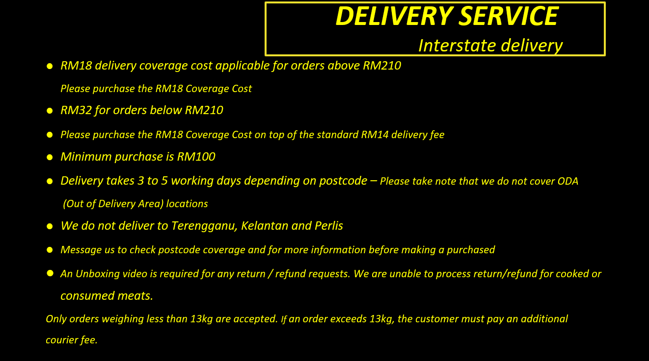 3) Interstate delivery is RM32 with RM14 off for orders over RM210. Please purchase "GKV RM18" from the product listing to proceed (refer to HOMEPAGE).
