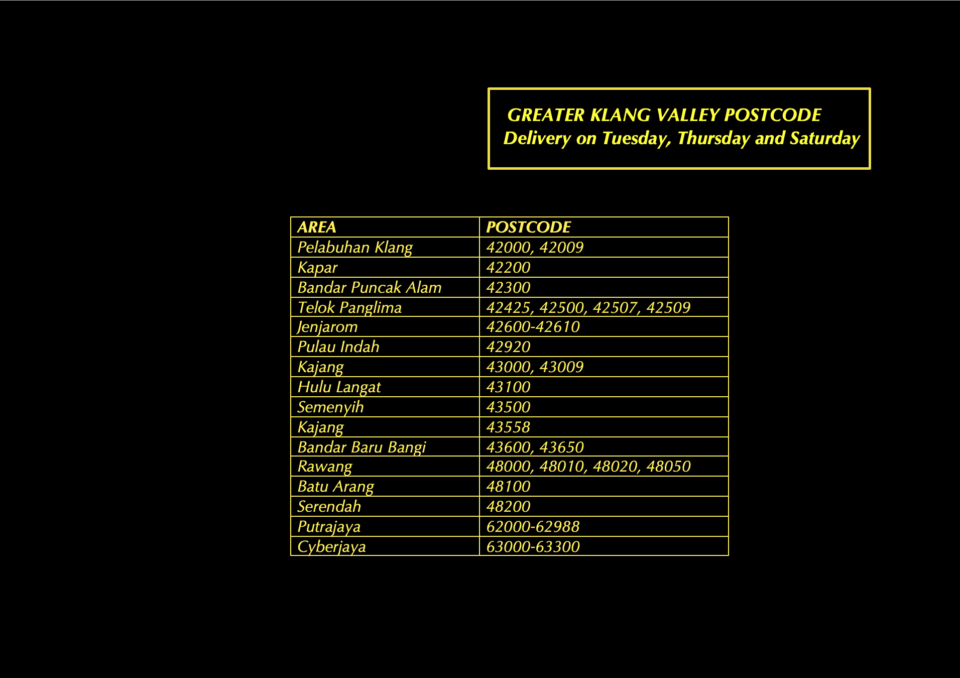 巴生谷地区的配送将在每周二、周四和周六完成。配送费为RM14,订单超过RM210可享受免费配送