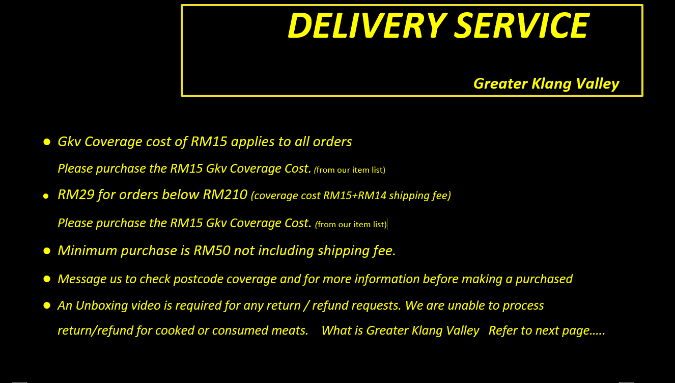 2) Delivery fee for Greater Klang Valley is RM29 with RM14 off for orders above RM210. Please purchase the "Coverage Cost RM15" from the product listing to proceed (refer to HOMEPAGE).