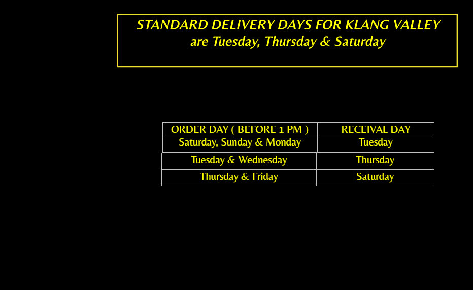 1) Delivery within Klang Valley will be completed on Tuesdays, Thursdays, and Saturdays. Delivery fee is RM14 and FREE for orders over RM210.